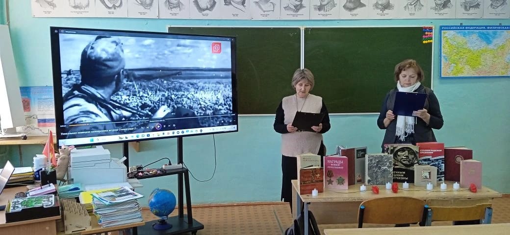 Ведущие подробно обрисовали значение Сталинградской битвы в истории Великой Отечественной войны. Они напомнили ключевые даты: битва началась 17 июля 1942 года и завершилась 2 февраля 1943 года, подчеркнув стратегическую роль Сталинграда как ключевого промышленного и транспортного центра на Волге. Подвиг защитников города был представлен как яркий пример мужества, стойкости и единства советского народа, повернувший ход войны в пользу антигитлеровской коалиции. Особое внимание уделено ключевым эпизодам: героической обороне Дома Павлова, где небольшая группа бойцов под командованием Якова Павлова удерживала позицию 58 дней, нанеся значительный урон врагу, и ожесточенным боям за Мамаев курган — высоту, символизирующую всю битву, где советские войска, несмотря на огромные потери, захватили вершину 15 января 1943 года. На большом экране демонстрировались подлинные кадры документальной хроники, включая записи боев, разрушенного города и триумфального салюта Победы. Эта визуализация оживила исторические события, усилила эмоциональное воздействие и позволила учащимся глубже осознать трагизм и величие подвига.
